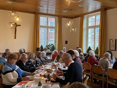 Teamsprecherin Maria Koch und Präses Pastor Clemens Lübbers begrüßen 50 Damen zum besinnlich adventlichen Nachmittag im Alten Pastorat. Nach den Grußworten genossen die Damen das reichhaltige Kuchenbuffet mit selbstgebackenen Kuchen und Torten vom Vorstandteam. Abgerundet wurde der Nachmittag mit Geschichten zum Thema „Wunder“ und dem Adventslieder singen, die musikalisch von Dr. Jan-Hendrik Mönch am Klavier begleitet wurden.